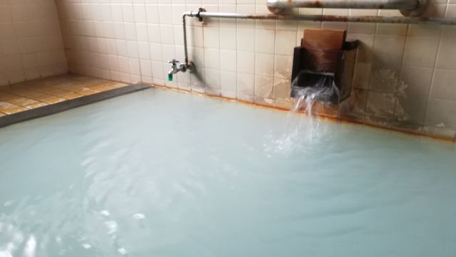 神秘的な白濁したお湯に黒っぽい湯の華がゆらゆら。