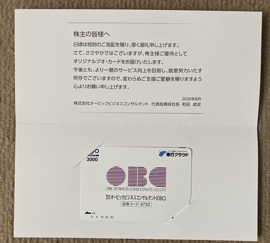 オービックビジネスコンサルタント(4733) 100株3000円相当のクオカード