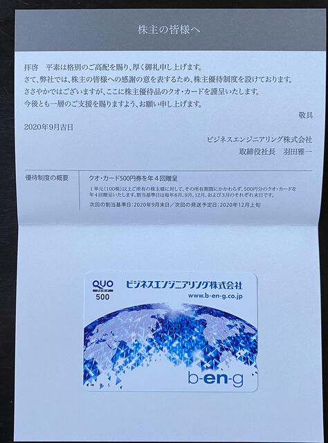 ビジネスエンジニアリングより、優待のクオカードが到着。