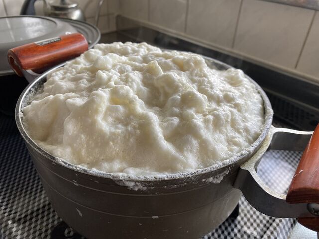 しぼり出した汁(豆乳)に、にがりを入れて、15分くらいすると固まってきます。