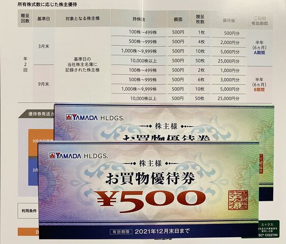 ヤマダホールディングス(9831) 100株500円の優待券1枚。2名義分です。