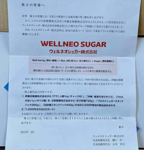 ウェルネオシュガー(2117)より、記念優待が届きました♪